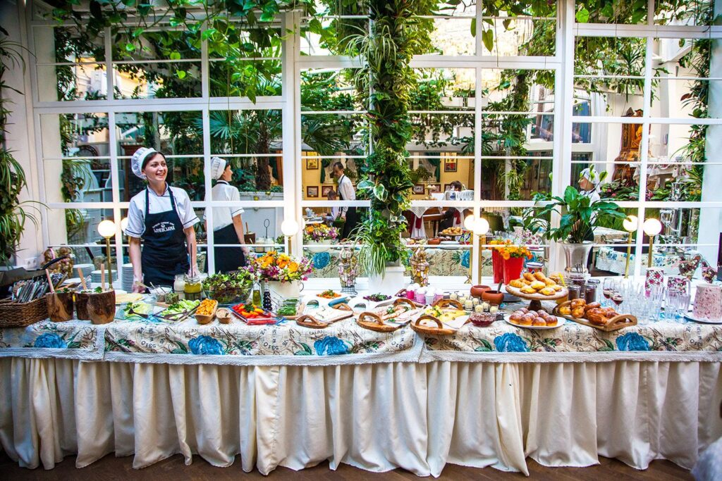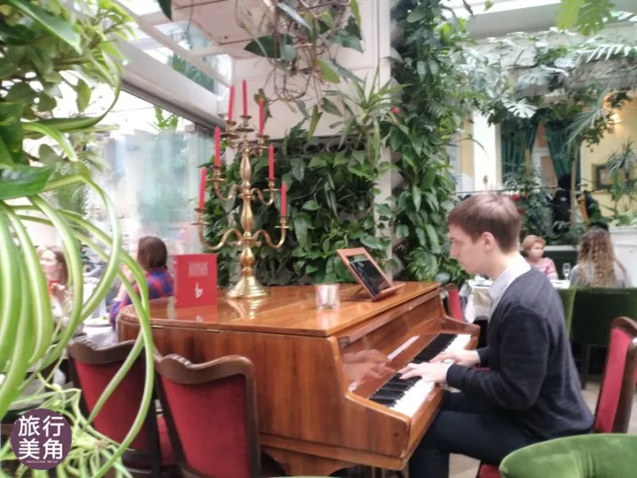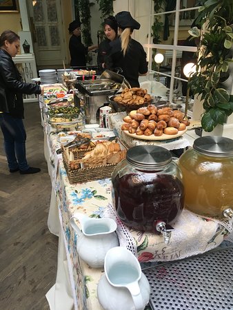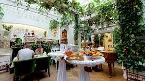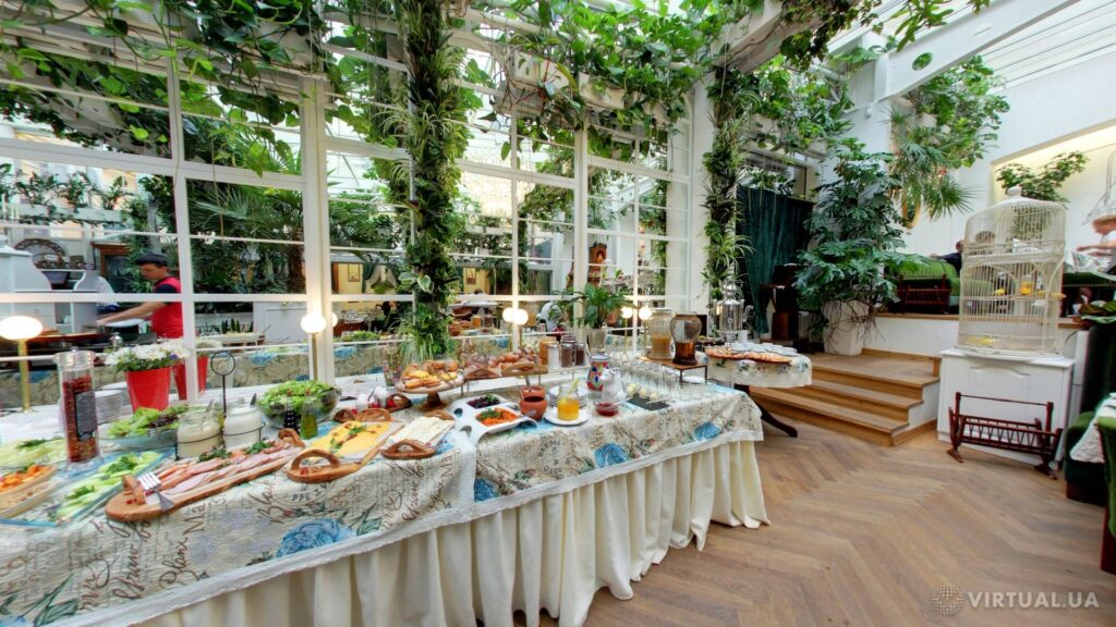 Iedere dag zit het restaurant uitgeladen vol, Van kelder tot zolder. Op de begane grond vinden we het lopend buffet tussen weelderige planten en vrolijk fluitende vogeltjes. Aan de verschillende tafels een rijk assortiment broodjes, vleeswaren, kazen en volop tomaat en fruit. Onder begeleiding van een pianist worden aan de andere tafeltjes de pannenkoeken, scrambled eggs en worstjes on demand klaargemaakt.
