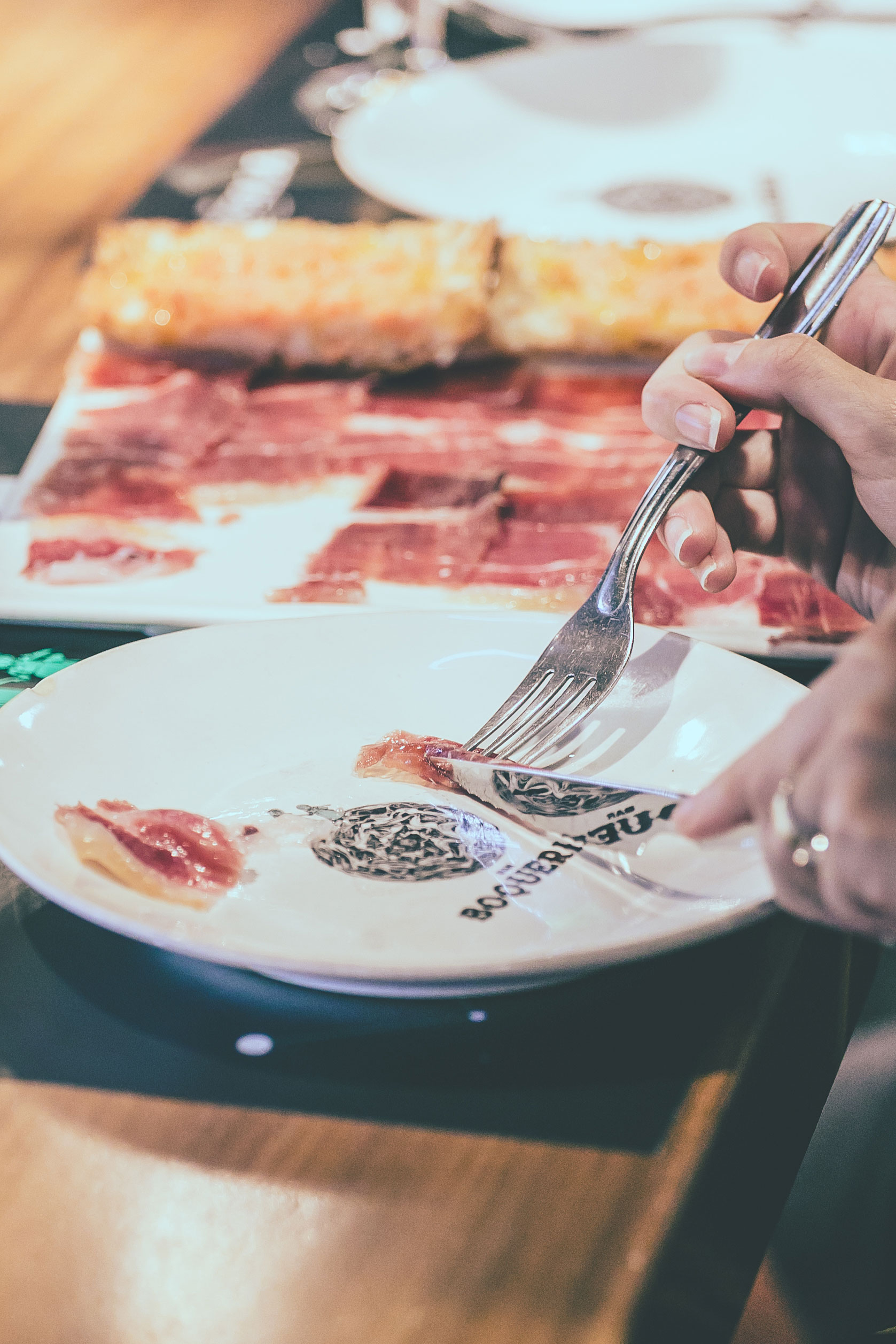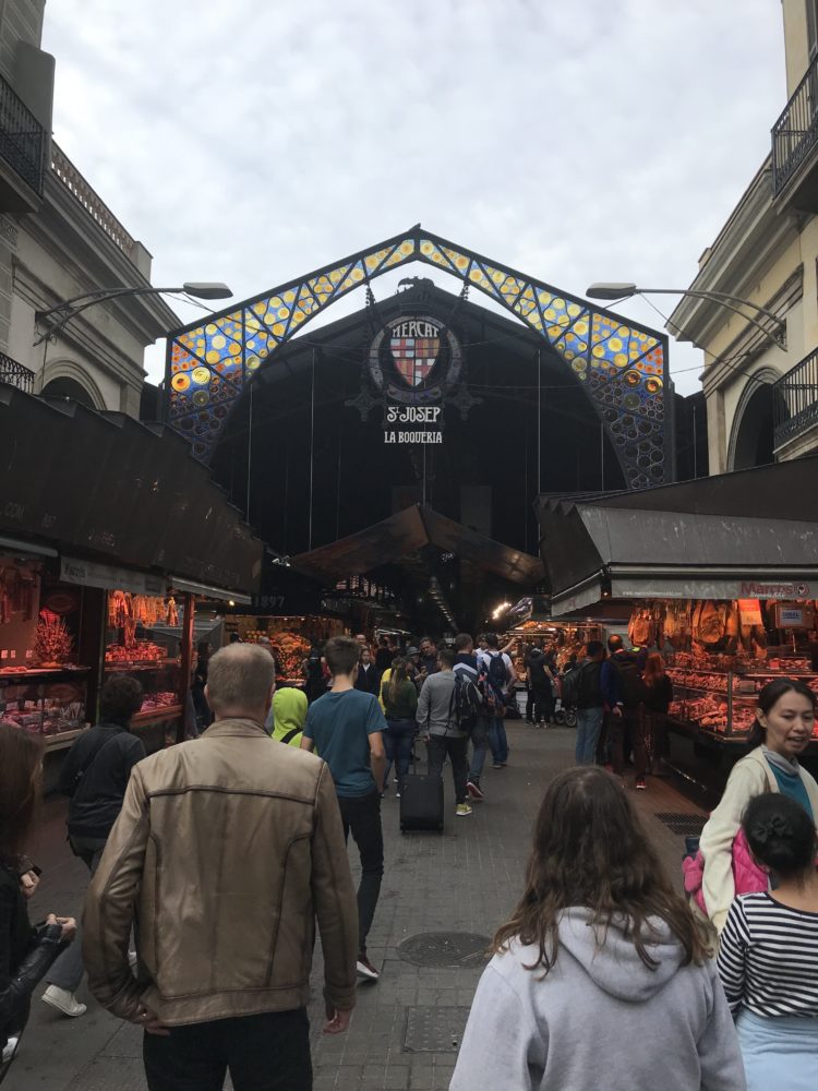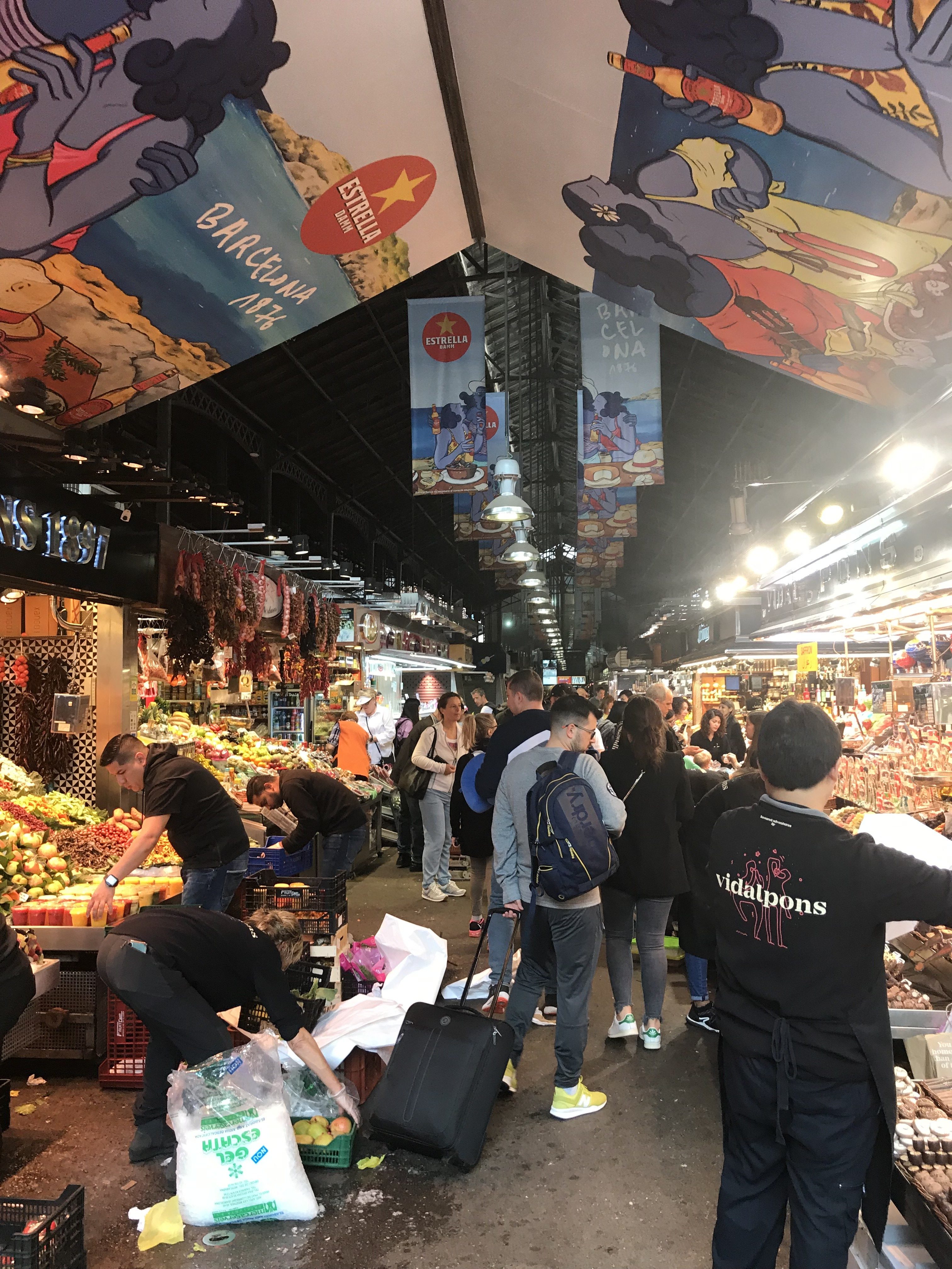Temidden van alle marktkraampjes ga je even aan de bar zitten om verse tapas te bestellen. Heerlijke verse grote olijven, vol van smaak, inktvis, garnalen en boterzachte Iberico ham.