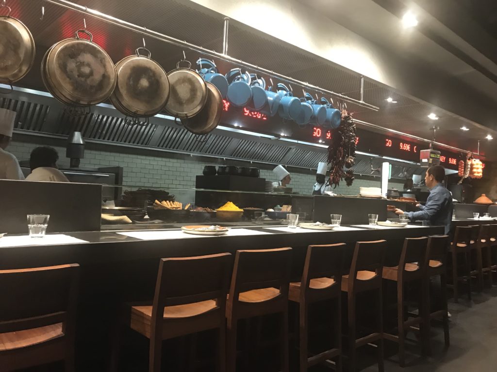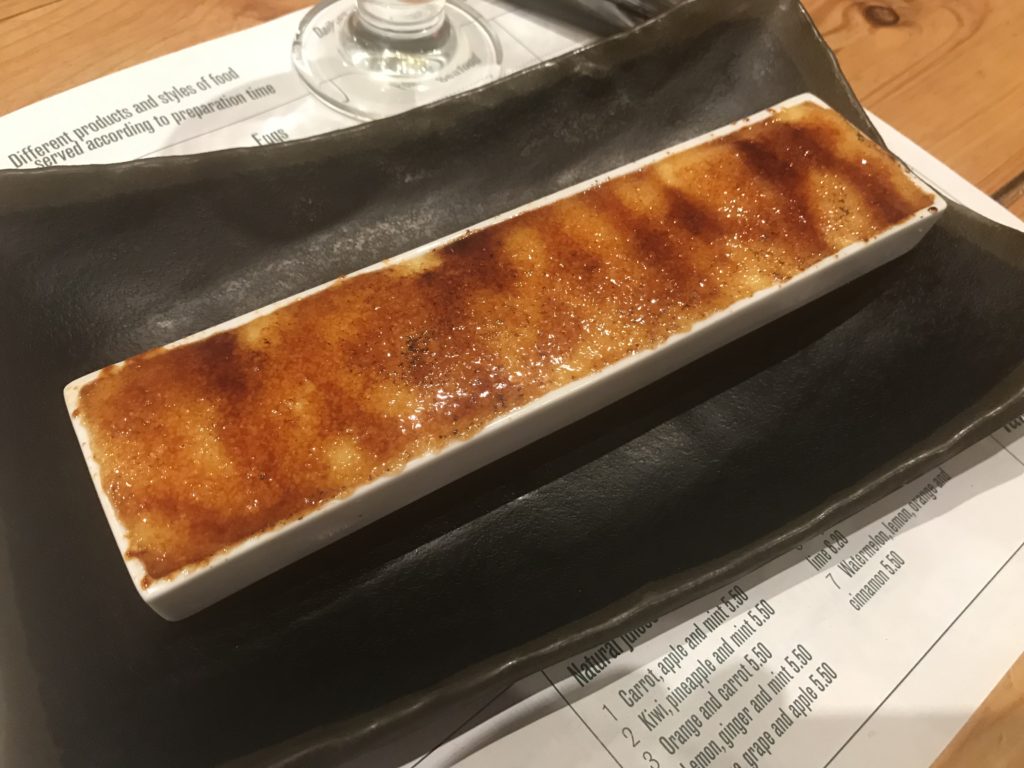 Het restaurant heeft een open setting en aan de tafels heb je vrij zicht op de open keuken. Bij het afsluiten van de maaltijd was er eigenlijk geen andere optie dan de lokale Catalaanse variant van de Crème brûlée te proberen; de Crema Catalana.