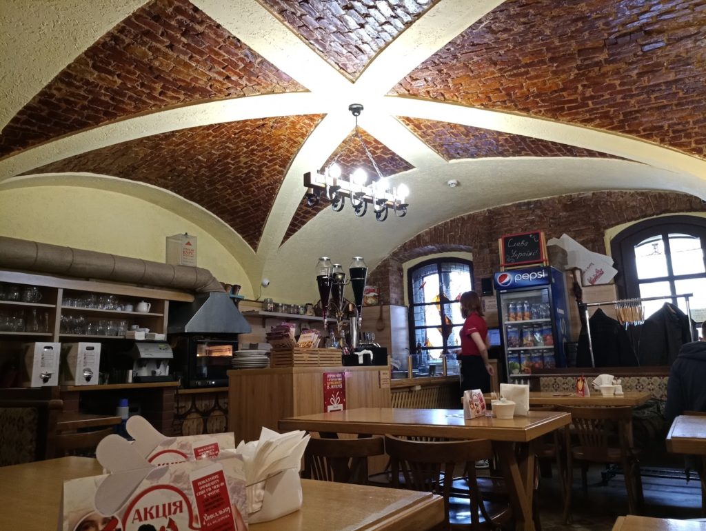 Het gezellige en fotogenieke centrum van Lviv barst van de leuke restaurantjes. In een achterafstraatje lopen we aan tegen een Georgisch restaurant. Het heeft een beetje een kantine achtige uitstraling, maar het eten is perfect. Met het hele gezin (5 personen) eten we hier voor slechts 25 Euro, inclusief drinken.